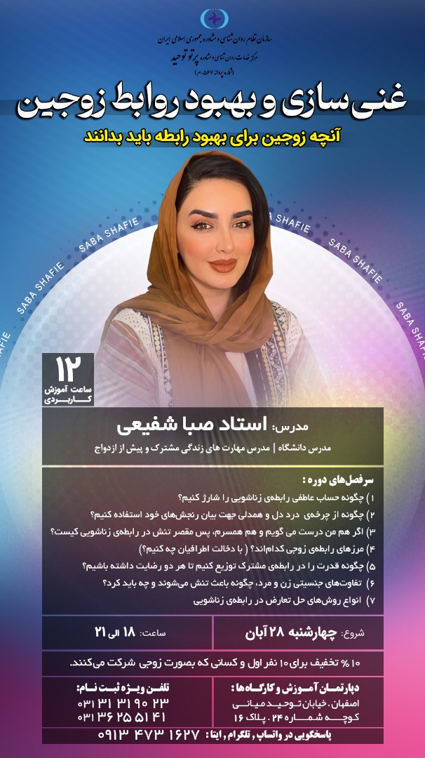 رزرو: ارسال عدد "50" به سامانه 10002527 ::: ثبت نام: 36255141 09134731627 ::: مکان برگزاری: مشاوره اصفهان ::: مرکز مشاوره توحید