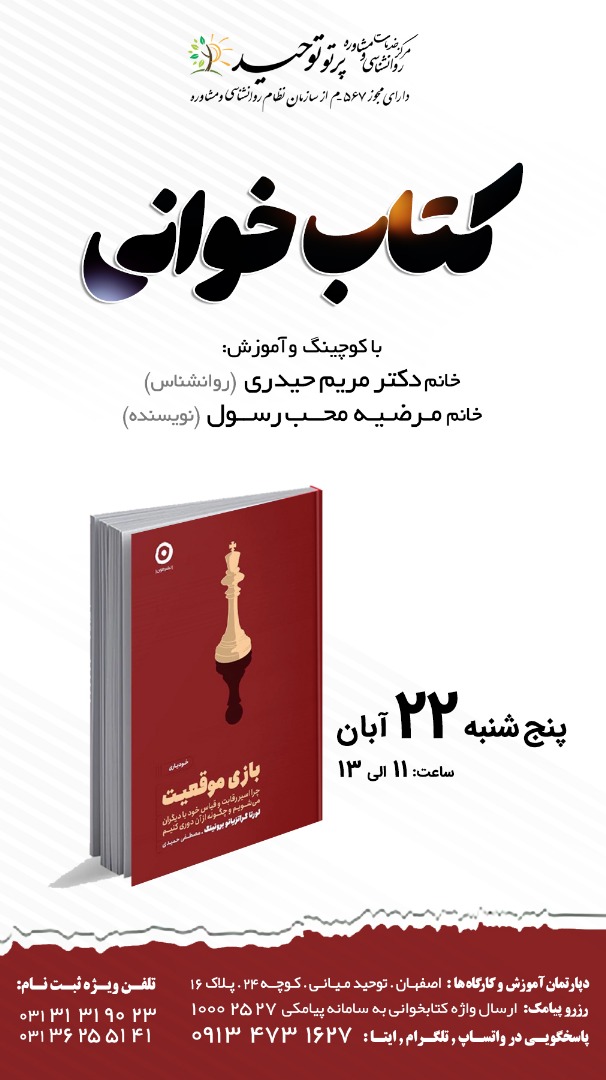 رزرو: ارسال واژه "جراحی روانی" به سامانه 10002527 ::: ثبت نام: 36255141 09134731627 ::: مکان برگزاری: مشاوره اصفهان ::: مرکز مشاوره توحید